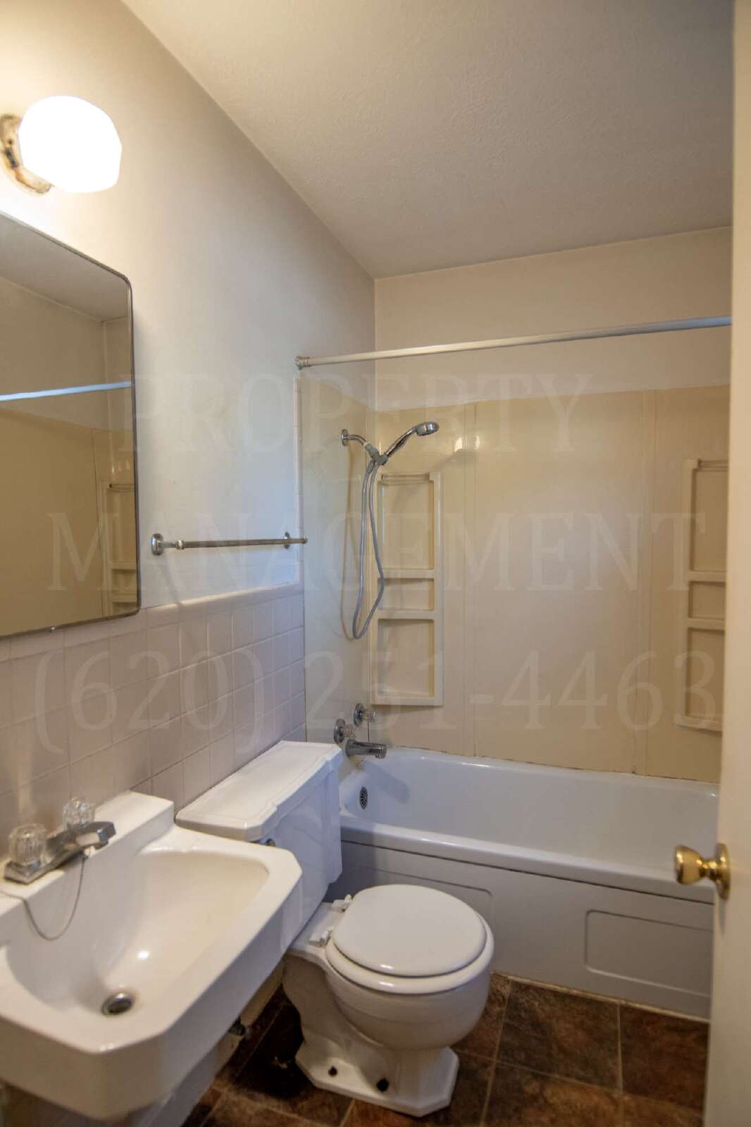 The kitchen boasts retro charm with white cabinets, a blue backsplash, and green countertops. The living room and bedroom have dark carpeting and ample natural light. The bathroom features a timeless look with white tile and a pedestal sink. Four closets offer storage, and the efficient layout ensures a cozy, practical space.