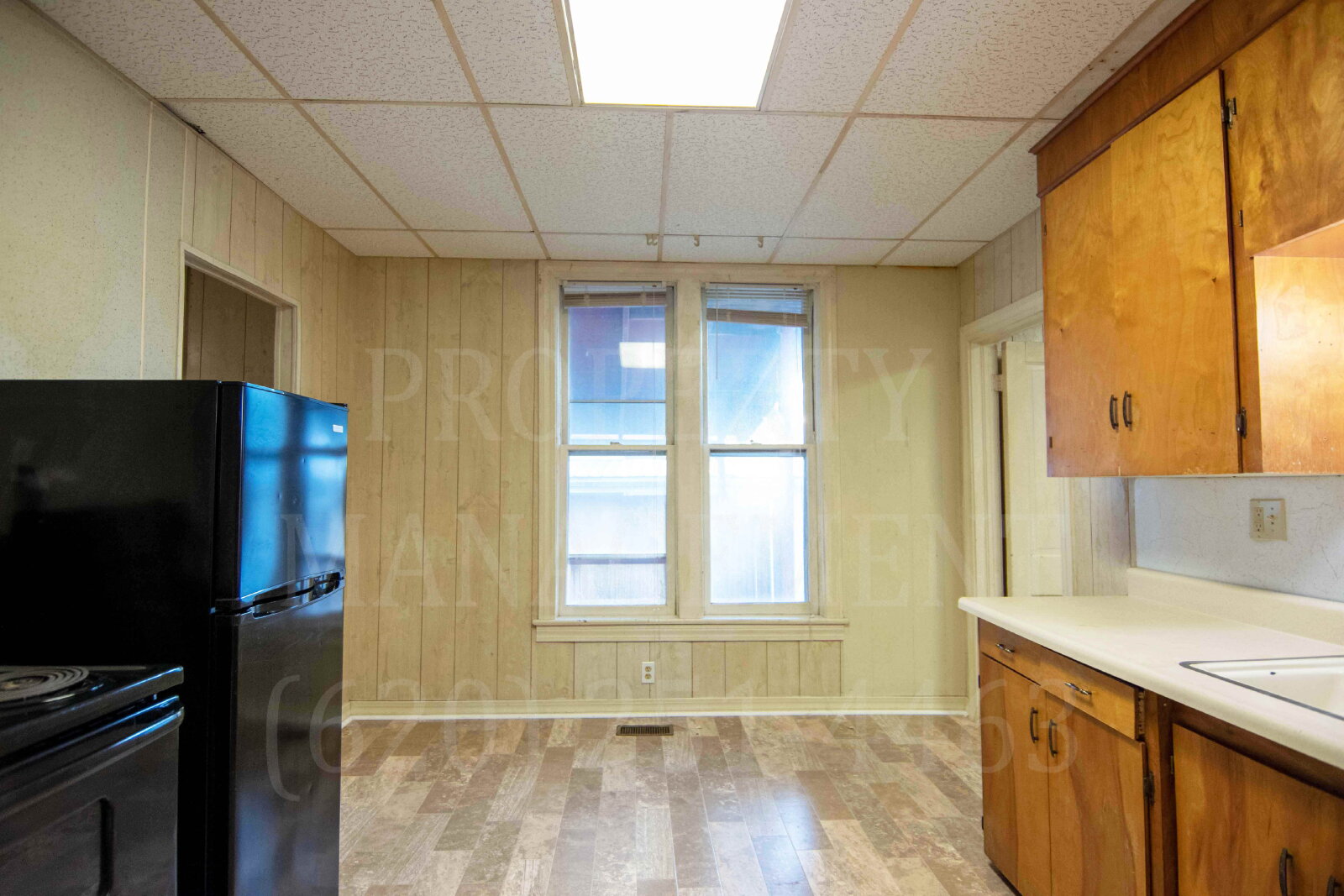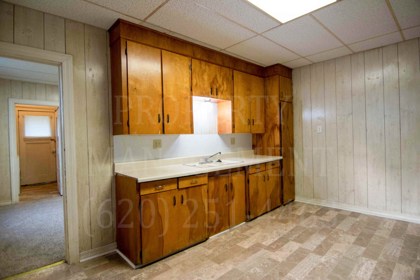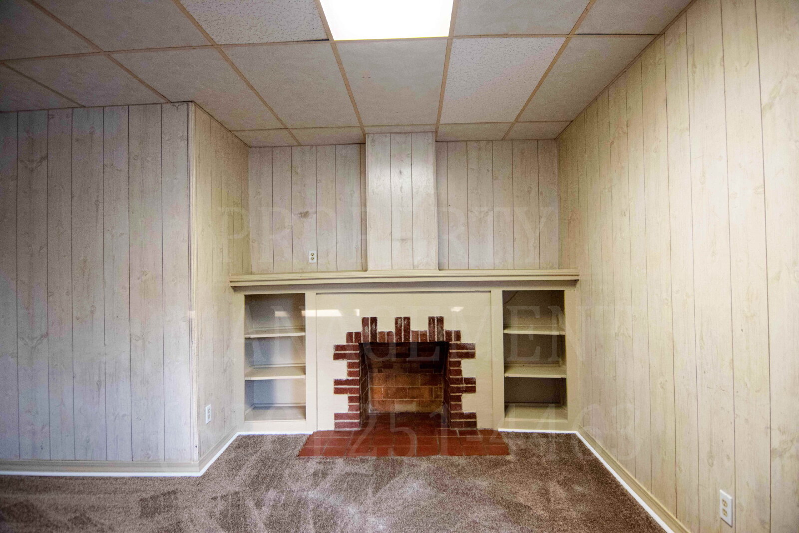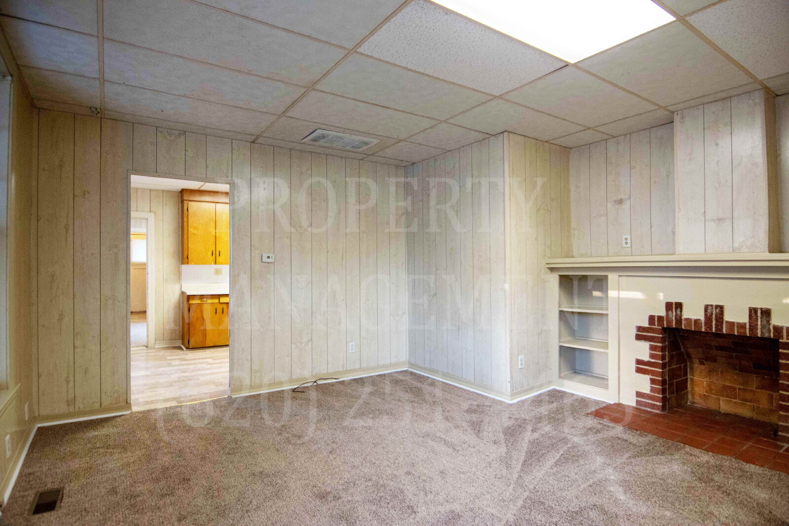This property features a single-floor layout with a mix of rustic and modern elements. The living area has a brick fireplace and built-in shelving, with light-colored wood paneling throughout.